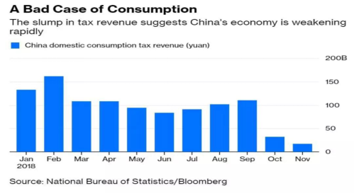彭博社(Bloomberg)根據(jù)統(tǒng)計(jì)局的資料繪制了如下圖表,去年十月份和十一月份,國家消費(fèi)稅的收入已大幅度減少。